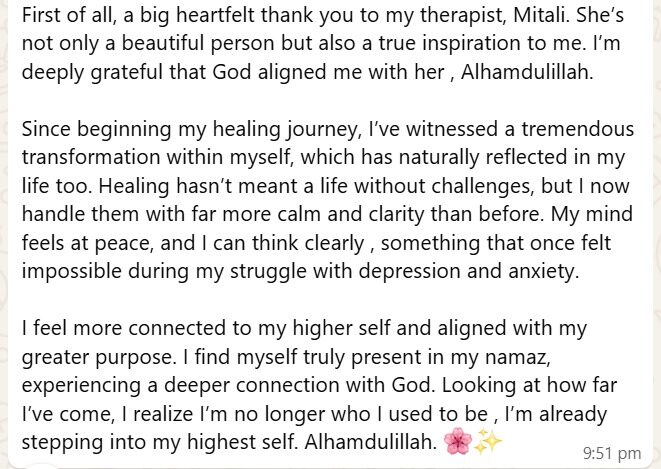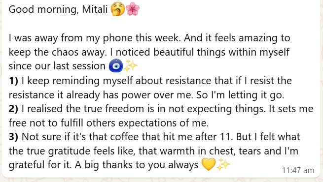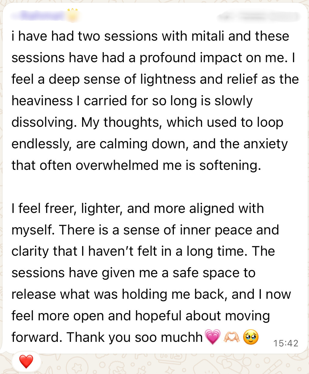 "Before my sessions with Servingyouniverse, I felt heavy every day. Now I wake up feeling lighter, calmer, and more confident in my choices."