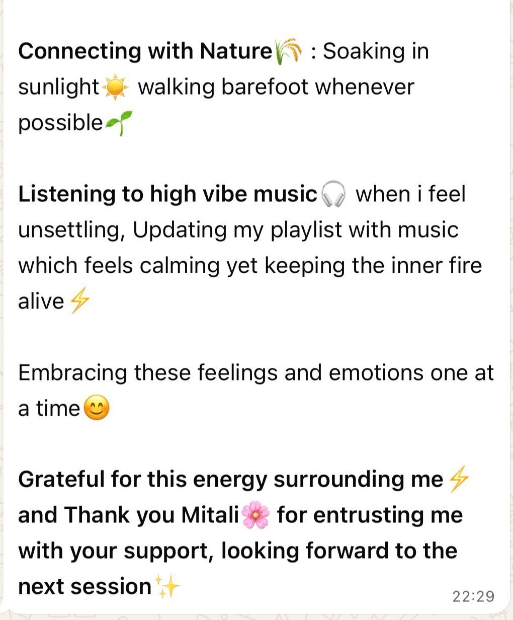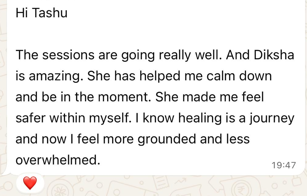 Tashu has experience working with adults through individual in-person and online sessions, addressing concerns such as anxiety, stress, overthinking, procrastination, relationship challenges, and work–life balance.
